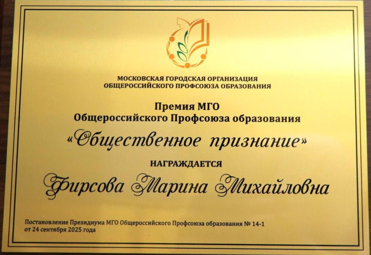 Премия Московской городской организации Общероссийского Профсоюза образования «Общественное признание» вручена Марине Михайловне под аплодисменты педагогического сообщества столицы!