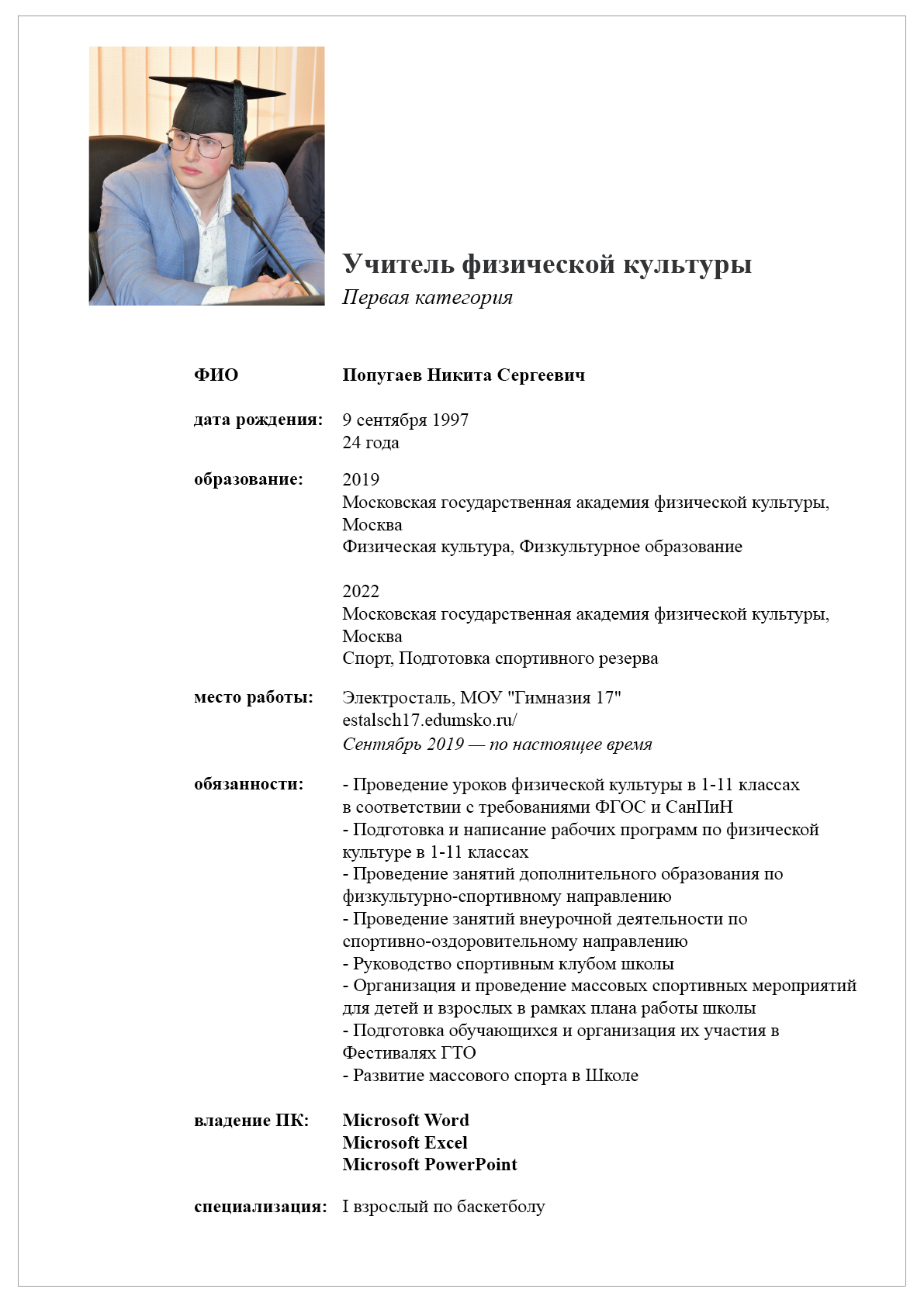 Ваше резюме получено. В случае открытия вакансии учителя физической культуры, с Вами свяжутся специалисты по кадрам для назначения даты собеседования.