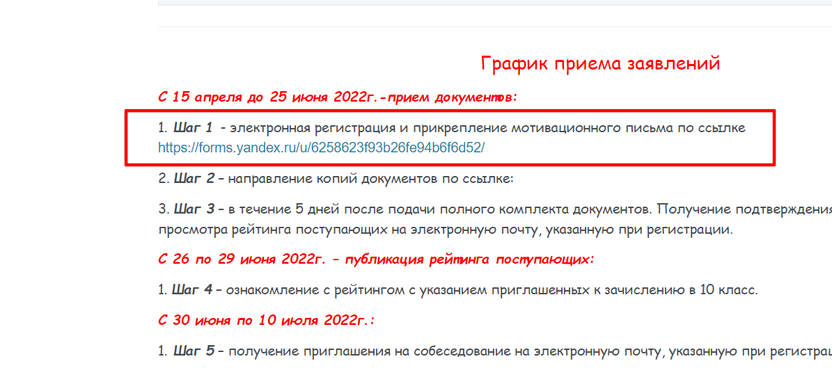 В разделе График приема заявлений опубликовано: Шаг 1 - электронная регистрация и прикрепление мотивационного письма по ссылке https://forms.yandex.ru/u/6258623f93b26fe94b6f6d52/