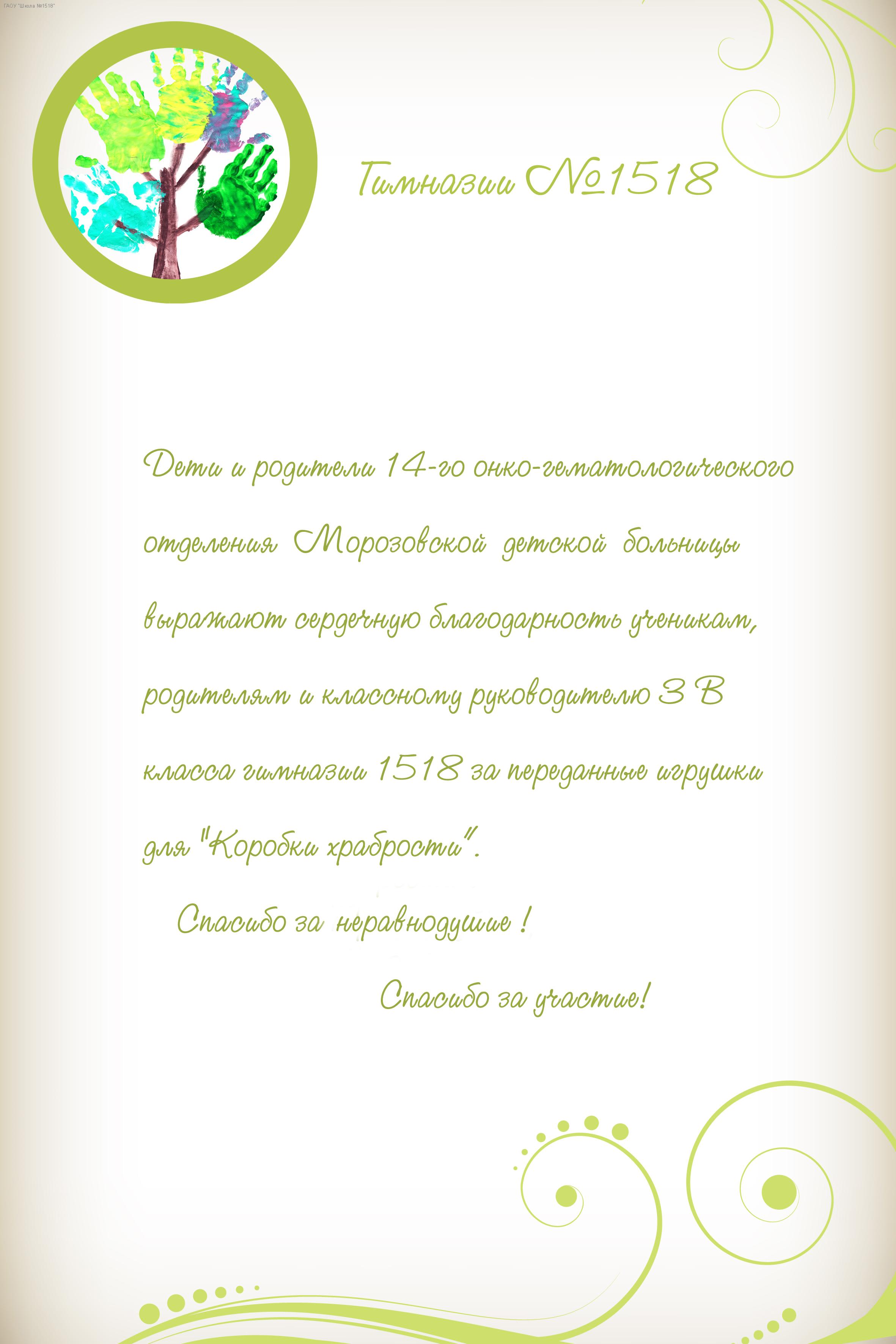 Дети и родители онко-гематологического отделения Морозовской детской больницы выражают сердечную благодарность 3В классу и классному руководителю Витько Н.В. за участие в международном благотворительном дне "Щедрый вторник", за собранные и переданные игрушки, за неравнодушие.